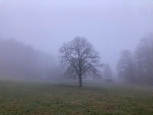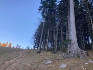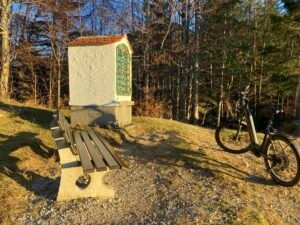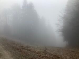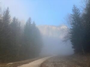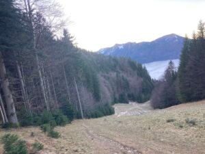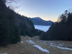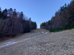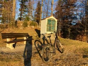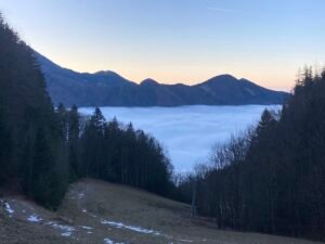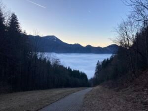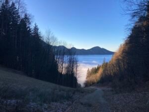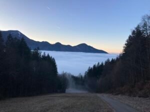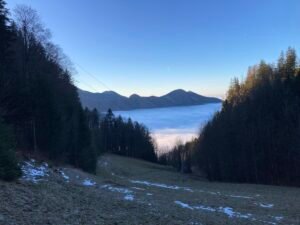 Im Tal war es heute wieder mega-trüb. Nebel. Nebel. Nebel. Dabei war klar, dass aufgrund der Inversionswetterlage keine 300 m höher schon wieder die Sonne scheint – oder zumidest kein Nebel ist. Also gings über die Skipiste Aschau straight forward die steile Variante bis zur Schlechtenberger Kapelle. Klappte sehr gut.