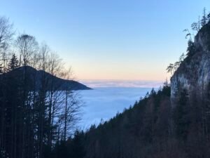 Die Bilder zeigen, wie unterschiedlich das Wetter am gleichen Ort sein kann: Unten dichte Suppe. Nass. Kalt. Trüb. Etwas weiter oben wird langsam grau zu blau. Märchenhaft. Geheimnisvoll. Vielversprechend. Schließlich kommt man irgendwann vollständig aus dem Nebel raus. Dann ist es es klar. Man hat gute Fernsicht. Und mit etwas Glück sieht man noch etwas von der Sonne. In jedem Fall beeindruckend: Die riesige weiße Wolkenschicht von oben zu sehen. Die reichte heute bis weit über IBayern hinaus. Vielleicht sogar bis Norddeutschland.