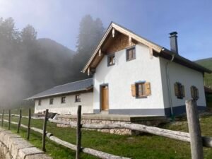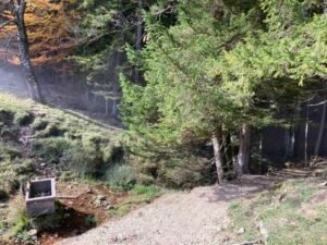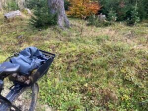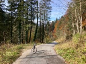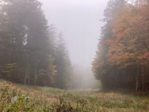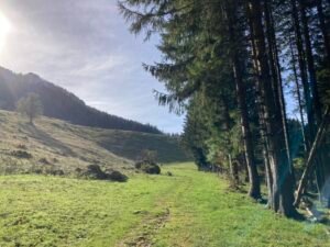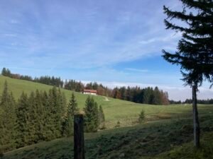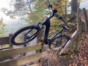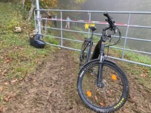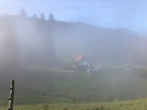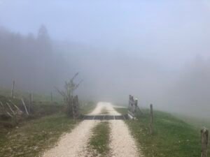 Gegen 12h gings am heutigen Sonntag los. Aber: Der Nebel wurde entgegen der Erwartung z.T. erst auf über 1.000m weniger. Sogar die wunderschöne Hefteralm auf 930m Höhe war bei der Hinfahrt noch total vernebelt. Von dort wollte ich – google maps folgend – nun noch die letzten Kilometer zur Rachlalm radeln, wären da nicht … ein Gatter und ein schwer überwindbarer Zaun gewesen. Achtung E-Biker: Hier ist Gewichtheben angesagt!