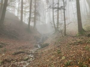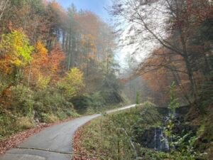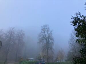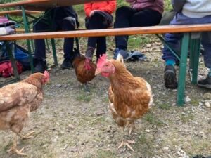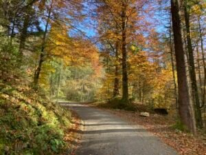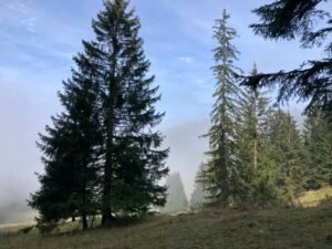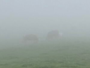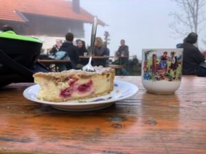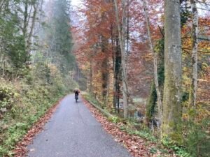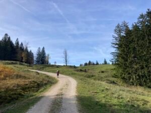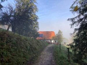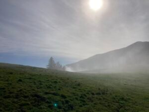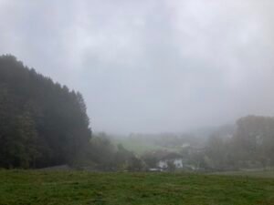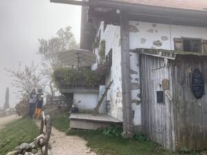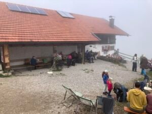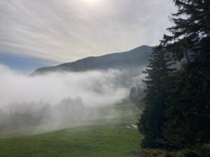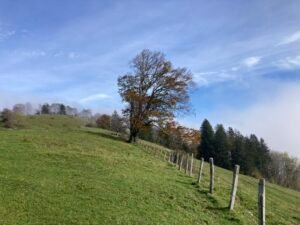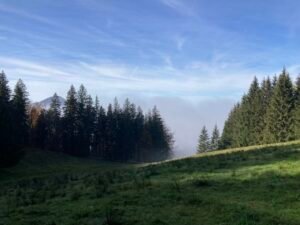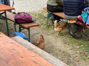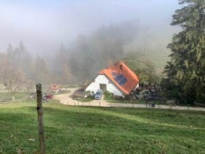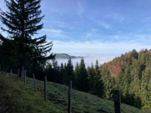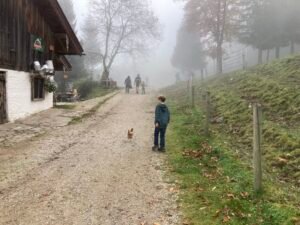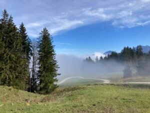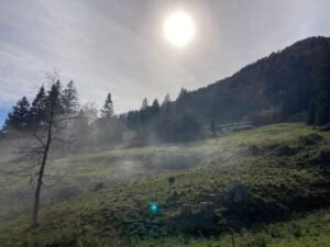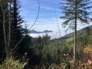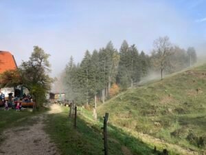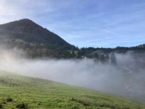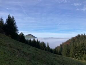 Bei der Hinfahrt hob ich das 27 kg (gefühlt 50 kb) schwere E-Bike über das Gatter, auf der Rückfahrt wählte ich den Zaun. Und dazwischen: Fuhr ich zur gut besuchten Hefteralm, auf der sogar noch Kühe auf über 900 Höhenmeter weideten Auch Hühner schwirrten den Gästen zwischen den Beinen unter den Tischen herum. Es war wie im Film, zumal dort nur wenige Höhenmeter Sonne und Nebel zu trennen schienen – ein Effekt, der zu einer Art „blauem Nebel“ führt.