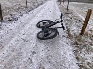 Erst gestern machte ich eine echt anstrengende Tour zur Sonnenalm. War richtig „knifflig“ – vor allem wegen dem vielen Eis. Aber am Ende kam ich wieder gut zurück ins Tal. Ganz ohne unfreiwilligen Touchdown. Den holte ich heute nach – und wie so oft an völlig überraschender Stelle. Es war ein Feldweg von Bach kommend kurz vor Hohenaschau … da machte es „rutsch“ und schon lag das E-Bike auf der Seite (und ich lag im Stacheldraht). Ging alles nochmal gut. Bestätigt aber irgendwie die Unfall-Logik: „Die meisten Unfälle passieren im Haushalt.“ Im übertragenen Sinn: „Die meisten E-Bike-Unfälle passieren dort, wo man nicht damit rechnet …“ Das vorletzte Bild zeigt auch ganz gut, wie das Hinterrad auf dem Eis weggebrochen ist.