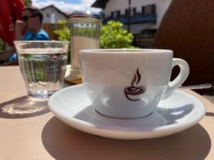 Mitte/Ende Mai ist es in Aschau bereits so mild, dass man am Badeplatz Aschau schwimmen kann. Richtig warm ist das Wasser zwar noch nicht, aber dafür umso erfrischender. Insofern gab es nach der Erfrischung eine kleine innere Erwärmung: Ein Käffchen im Cafe Rosa.