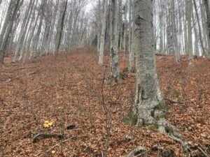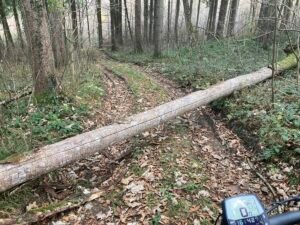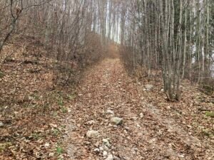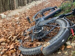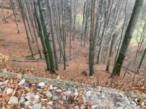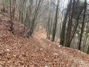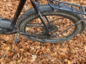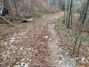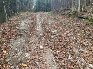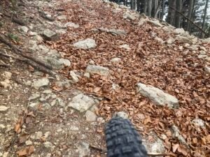 An manchen Stellen war die Laubschicht gut 10 Zentimeter hoch. Deshalb sieht man das Geröll nicht, was wiederholt zu durchdrehenden Rädern führt. Doch auch ohne Geröll sind 5-10 Zentimeter Buchenlaub ausreichend, damit die (noch gut profilierten Reifen) durchdrehen. Es ist so als ob man mehrere Lagen Papier aufeinanderlegt. Sie drücken sich gegenseitig weg, wenn man – wie hier am Berg – mit hohem Drehmoment agiert.