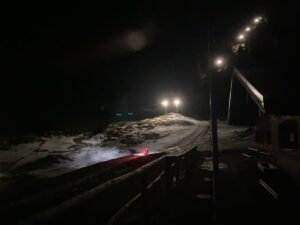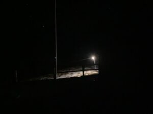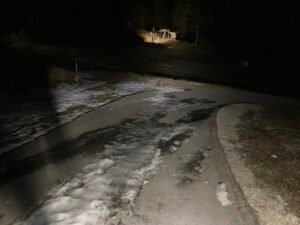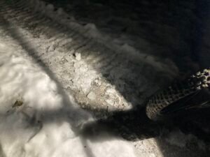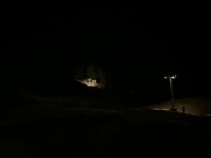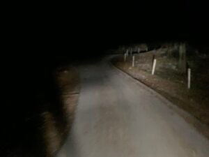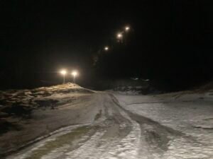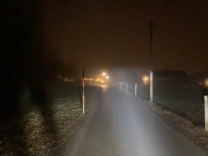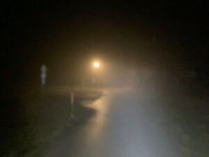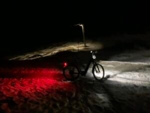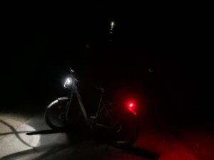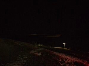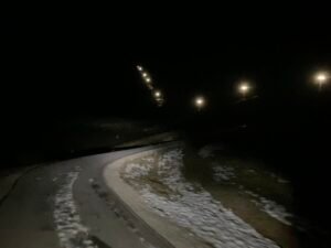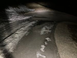 Das Wichtigste zuerst: Ich bin gut rauf und vor allem wieder gut runter gekommen. Dass man überhaupt darauf hinweist, liegt daran, dass ich hier unter gleichen Bedingungen schon ein halbes dutzend Stürze erlebt habe. Manche davon recht unsanft. Gerade bei Nacht (und selbst mit bester Beleuchtung am E-Bike) sieht man die „Mini-Eisflächen“ oft erst im letzten Moment. Wenn man dann darauf ausrutschen und auf dem Boden landen sollte … dann heißt es „Autsch“!