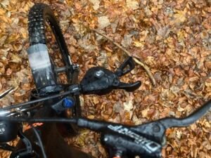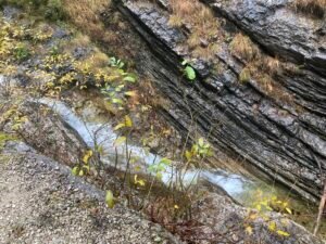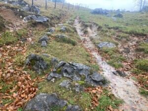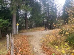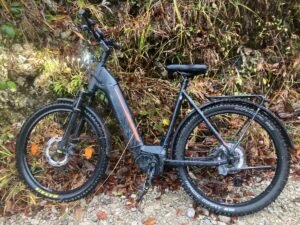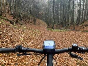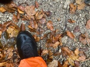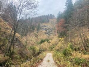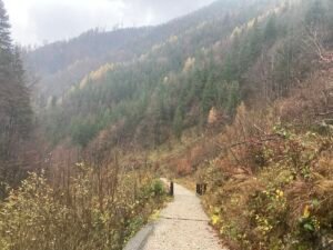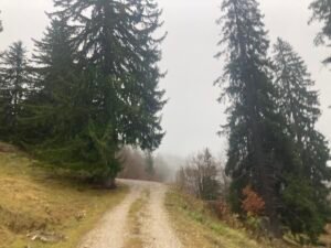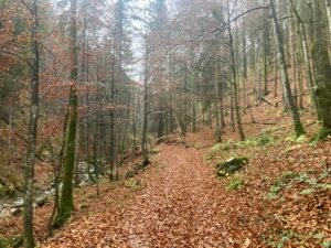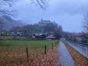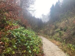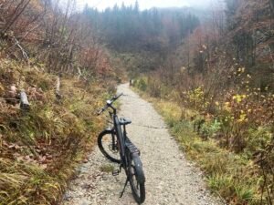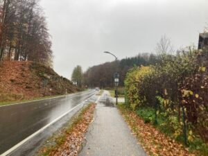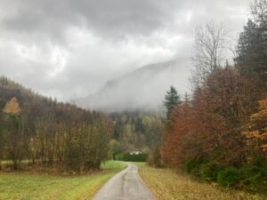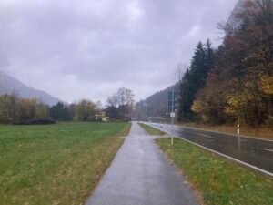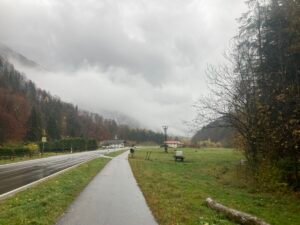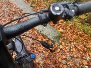 Dank meines neuen wetterfesten Kjus-Skianzugs in feschem schwarz-orange (passend zu Schuhen und E-Bike) konnte ich unbekümmert losfahren. Unterwegs gab es ausser einem herbstlichen Grau und Feuchtigkeit auf allen Wegen und an allen Ecken kaum weitere Highlights. Bei solchen Verhältnissen muss man sich auch aufgrund der erheblichen Rutschgefahr (insbesondere wegen Blättern) permanent auf den Weg konzentrieren.