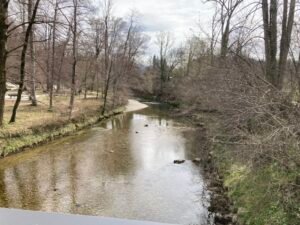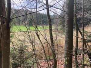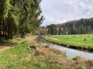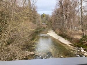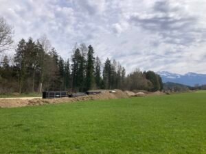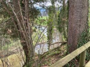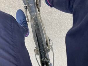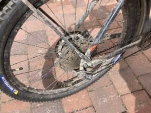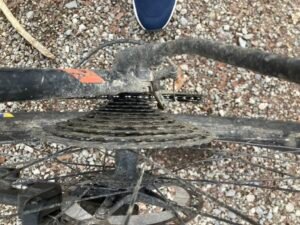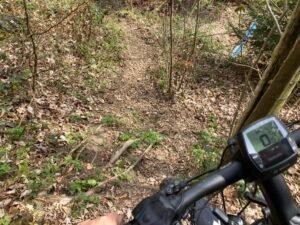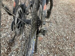 Kurz nach der kleinen Brücke schaute ich mir dann das Schaltwerk näher an. Es war ordentlich verbogen und das Schalten auch nicht mehr richtig möglich. Offenbar hatte sich beim Fahren das Schaltwerk weiter verzogen bis es hieß: „Rien ne va plus“. Mit einem Stock bog ich das Schaltwerk wieder halbwegs zurecht. Werkzeug hatte ich heute keines dabei.