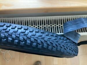 Luis gab mir noch einen guten Tipp: Die Reifen vorher auf der Heizung aufwärmen, dann lassen sie sich leichter montieren. Genau das war ja gestern bei den Schwalbe Magic Mary ein echtes Problem und möglicherweise sogar die Ursache für ein neues Loch?! Also nahm ich erstmals das Hinterrad mit ins Esszimmer. Zudem wärmte ich den Michelin Force AM2 über der Heizung auf. Tat ich auch mit dem neuen Schwalbe Schlauch, den ich ebenfalls gekauft hatte. Und siehe da: Selbst ohne Werkzeug konnte ich das Rad mit den aufgewärmten Mantel mit bloßen Händen montieren …