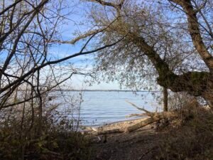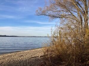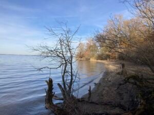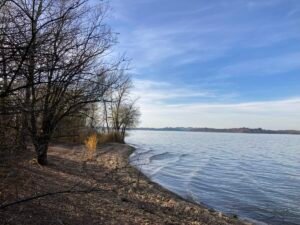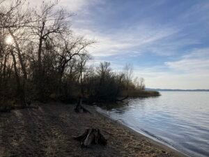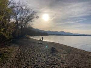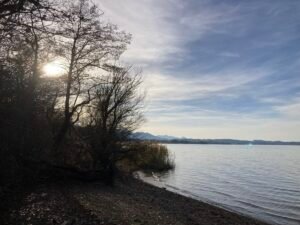 Derart gestärkt ging es weiter Richtung Übersee. Eigentlich sollte die Fahrt zum Sundowner gehen, doch zwischendrin bog ich dann auf einen mir bislang nicht bekannten Feldweg ab. Dann gabs die dritte Entdeckung: Einen wunderschönen, aber recht gut versteckten Chiemseestrand. Dort war ich zwar nicht wirklich allein, denn die Ecke ist offenbar einigen Insidern bekannt gewesen, für mich war es dafür ein tolles (erstes) Erlebnis! So oder so ähnlich kann man sich das Chiemseeufer vorstellen, wie es noch vor über 100 Jahren gewesen sein muss: Fast eine Art Mangrowenwald, komibiniert mit der Copa Cabana.