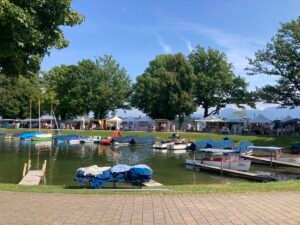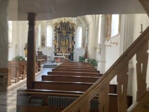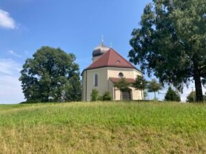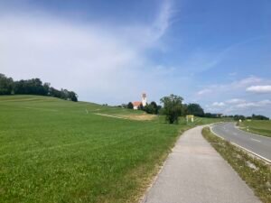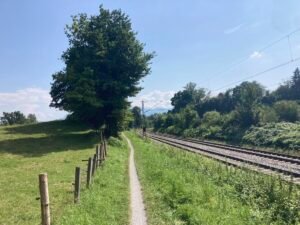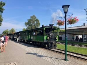 Die Strecke führte über St. Salvator – tolle Kirche nahe Prien. Dann über die Anhöhe von dort nach Rimsting. Am Kultbahnhof angekommen war es erstens schon – entgegen der Erwartung – richtig heiß. Zudem war ich ausgerechnet in der „Nachmittgaspause“ dort. Also keine Erfrischungsgetränke. Daher gings einen coolen Weg entlang der Eisenbahnstrecke München-Salzburg in Richtung des Badeplatz „Schafwachener Bucht“. Trotz herrlichem Wetter kaum was los an diesem tollen Badeplatz. Ich trank eine Cola (light) und fuhr weiter Richtung Prien. Dort filmte ich die dampfende Straßenbahnlokomotive der Chiemsee-Schmalspurbahn. Cool: Ich wollte ja zum Kultbahnhof – und nun landete ich bei einer Kult-Lokomotive ;-).